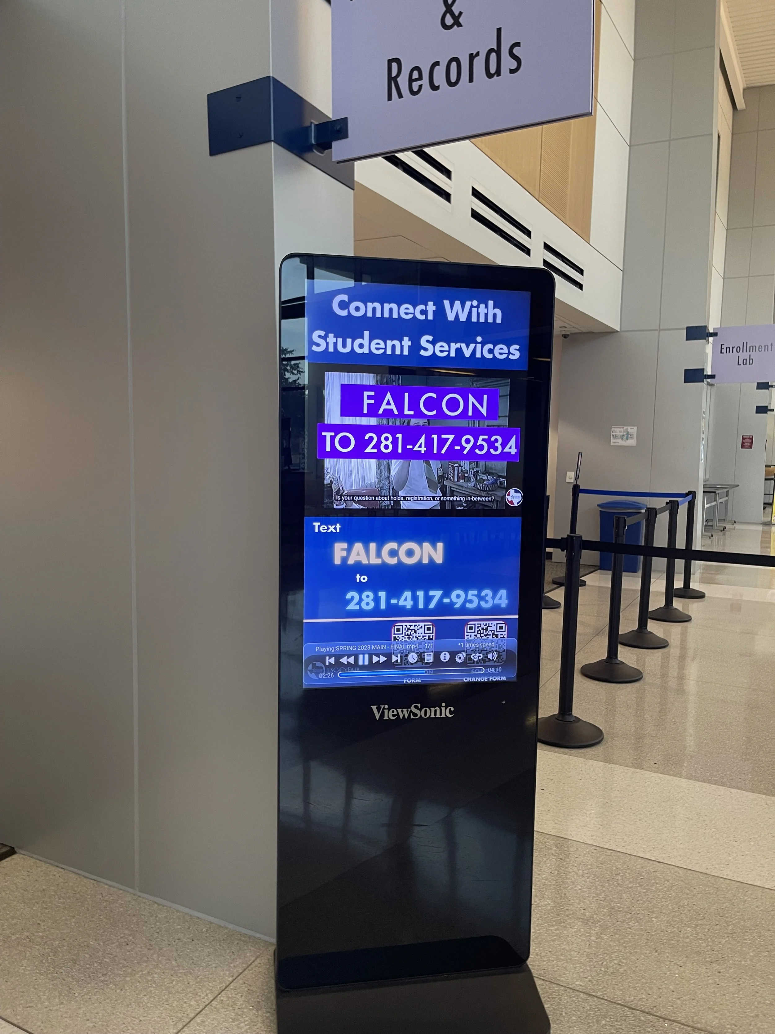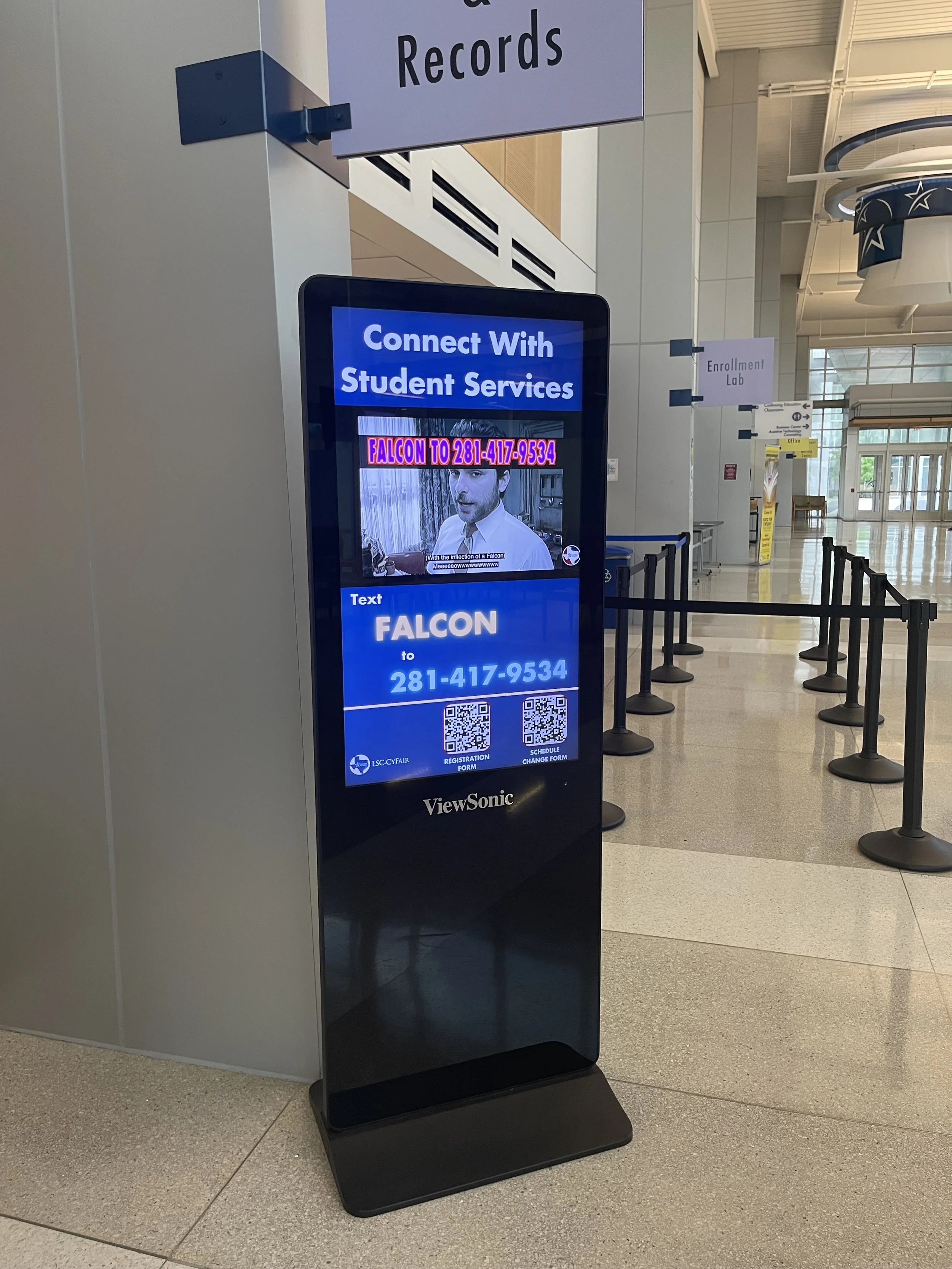 The purpose of this project was/is to utilize the View Sonic screen on display in the main lobby. The screen is utilized to display important information about various topics. It was/is also used to push various “marketing” objectives (QR codes for forms, calendars, etc.) and student services text help line.